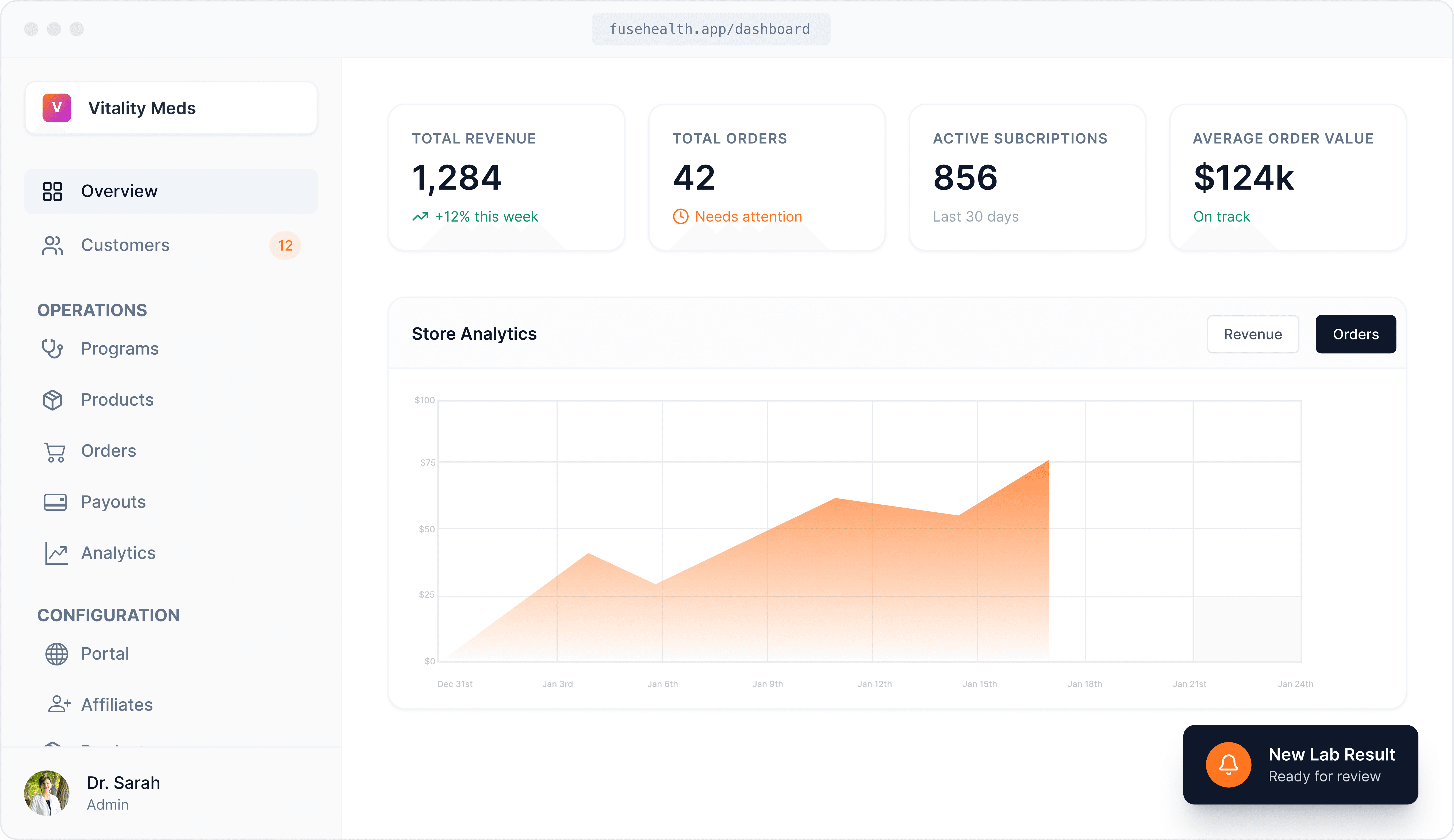 Track every patient journey from a single dashboard. Monitor intake status, prescription approvals, and active subscriptions in real time.